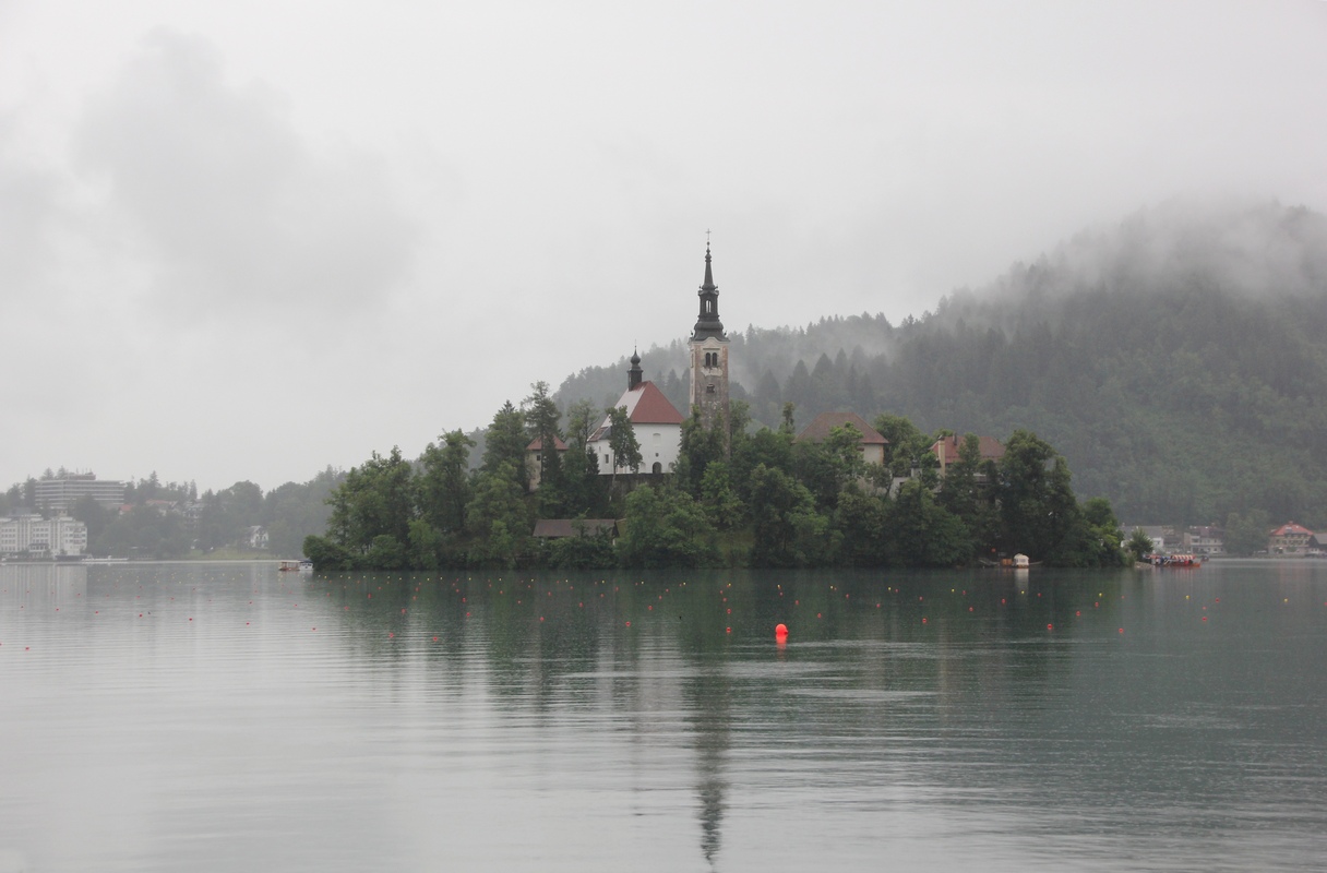 Järvi on pieni, melkeinpä lampi, ja todella kirkasvetinen. Sen ainoan saaren täyttää lähes kokonaan kirkko, jolla on monimutkainen nimi. Rannan pystysuorasta kalliosta kasvaa linna, melko pieni sekin, mutta vaikeastivallattava ja sympaattinen. Kiersimme järven autolla, siihen meni noin vartti. Muutaman näköalapaikan jälkeen alkoi kuitenkin taas sataa, piti palata lähtöruutuun.