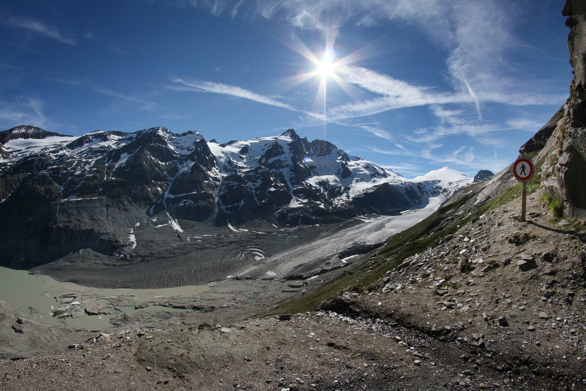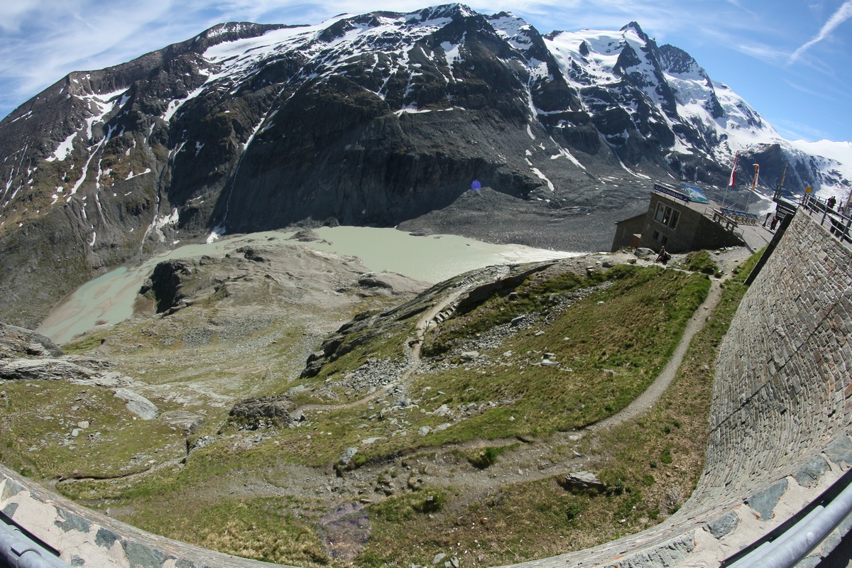 Pasterzen jäätikkö. Jäätä on joskus ollut melkein kaiteeseen asti.