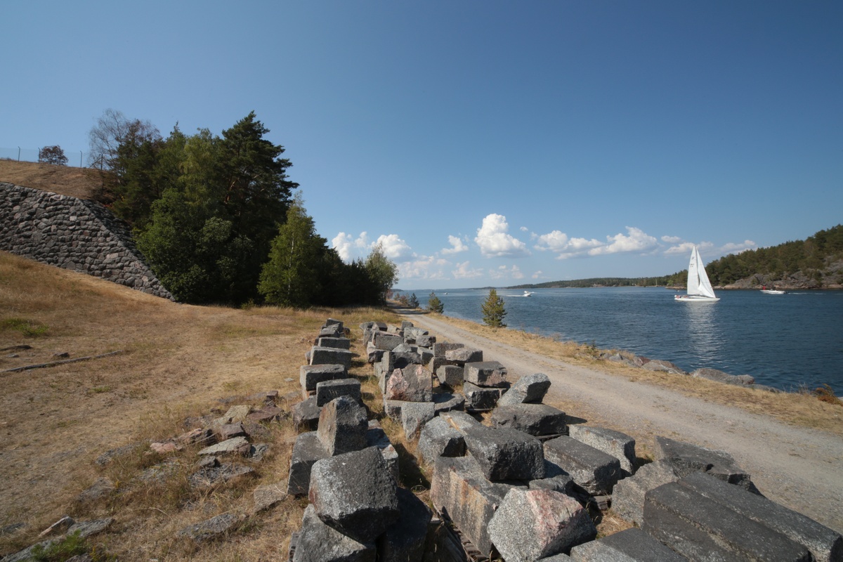 Läjä kiviä rannalla. Ehkä nämä jäivät yli, kun Fredriksborgin verhousta purettiin Vaxholmin korjausta varten