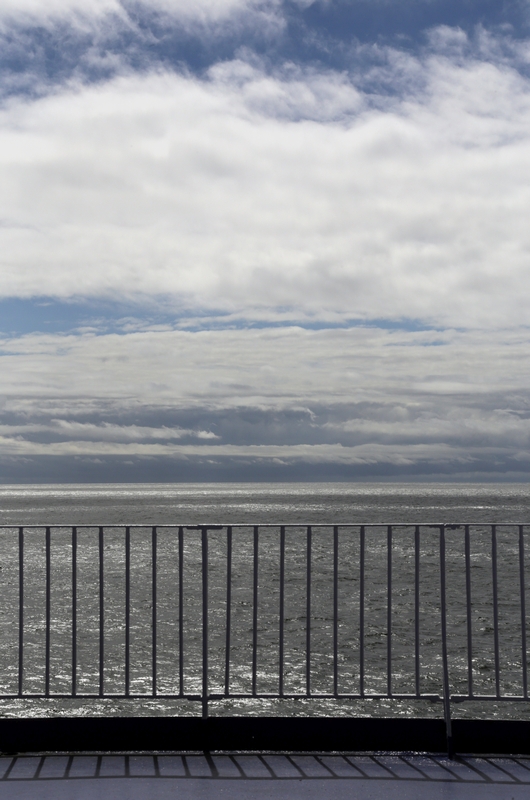 Laiva lähti melkein heti kun ehdimme sisään. Pieni purkki, hyvin vähän matkustajia, ei oikein mitään tekemistä. Keulaloungesta näki suoraan eteenpäin, se sai kelvata. Noin puolivälissä matkaa sää selkeni, alkoi paistaa oikein kunnolla. Kävin aurinkokannella, toisella puolella tuuli ankarasti ja toiselle kertyivät kaikki piipun dieselsavut. Ihastuttavaa.