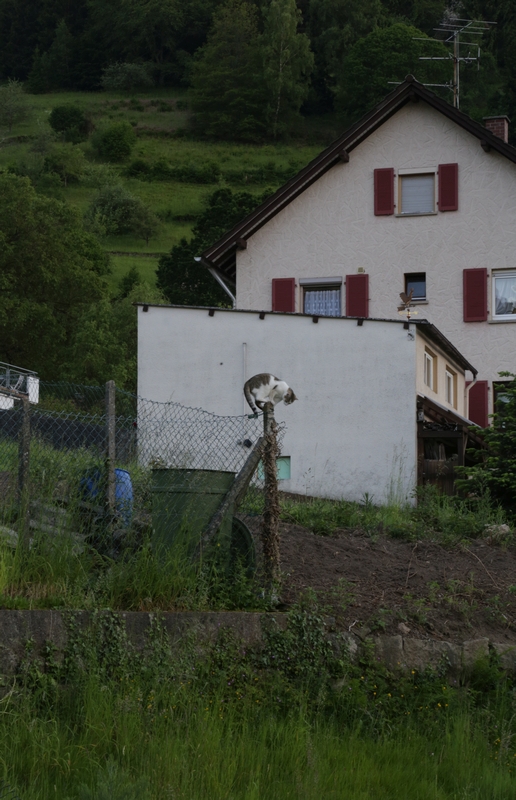 Muistiinpanot esiin. Bad Rippoldsau-Schapbachissa on vesiputous, sinne siis. Navigaattori sekoili, kuten tapana on - poukkoilin risteyksissä kuin hölmö, kun se ei osannut päättää. No, siitäkin selvittiin. Kiemuratietä kuusten keskellä, ohi hylättyjen ja toimivien hotellien, joita ei alkuun erottanut toisistaan, paahteiselle kentälle jolle kuului puron solina. Vesiputous kilometri tuohon suuntaan, jyrkkää ylämäkeä, ilman varjoa. Ääh. Jos olisi edes vähän viileämpi, tai jalassa vaikka shortsit, voisin lähteä - vaan tänään en taida. Jos kuitenkin kämpille rentoutumaan?