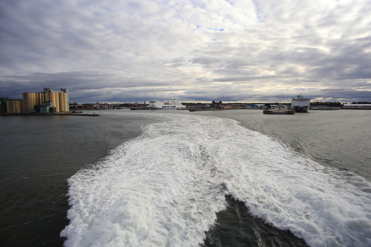Pikapakkaus ja satamaa kohti, laiva lähti 08:30 ja jonossa oli syytä olla aiemmin. Ystadissa olisi saattanut olla enemmänkin nähtävää - mutta hei, mehän palaamme vielä. Laiva ei ollut SuperSeacat vaan Express 1, maailman toistaiseksi suurin dieselkäyttöinen katamaraani - jonka huippunopeus on vaatimattomat 40 solmua. Ja kun satama-altaasta pääsimme ja kapteeni käänsi hanasta, se todellakin kulki. Ylityksestä ei muuta raportoitavaa, söimme patongintäytteellä päällystettyjä leipiä, jotka voitelimme paikan päällä, Kristan pöllimällä veitsellä.