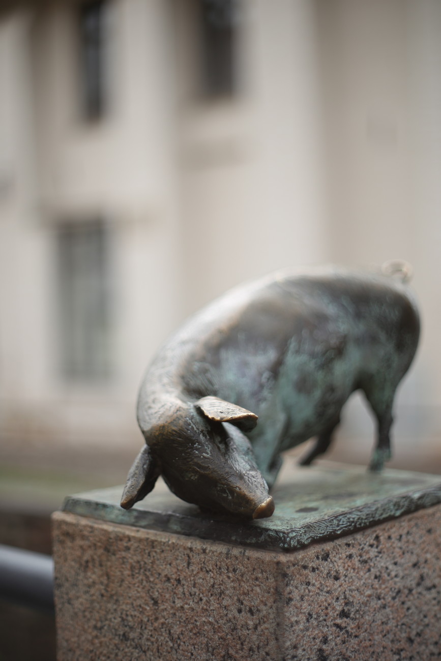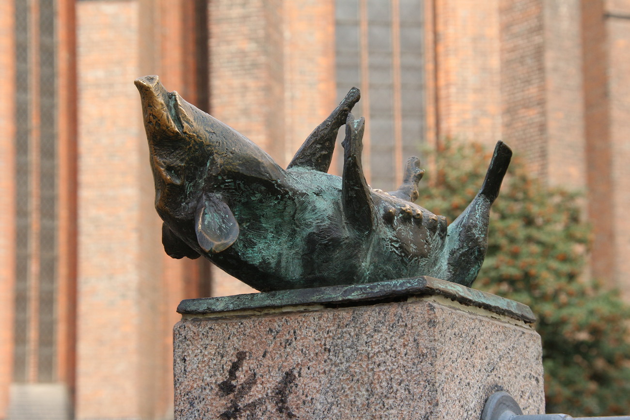 Kapeat, kanavasta heijastuvat talot toivat mieleen hollantilaisen pikkukaupungin, rakennustyyli taas Lyypekin ja Hampurin. Wismar taisi välttyä aika hyvin pommituksilta ja Itä-Saksan uudistusvimmalta, ei näkynyt yhtäkään elementtitaloa tai muuta keskuskomiteaan viittaavaa. Kirkko oli sentään hieman myöhempää aikakautta, siitä nimittäin puuttuivat gargoilit. Pettymys. Sikasilta kirkon kupeessa taas lunasti odotukset; jokaisen neljän pilarin päällä pieni pronsinen sika, ilmeikkäissä asennoissa. Moni turisti ei näköjään tiennyt, että tällainenkin on - spontaanit riemunkiljahdukset huvittivat hetken jos toisenkin - ihan kuin olisivat sian nähneet.