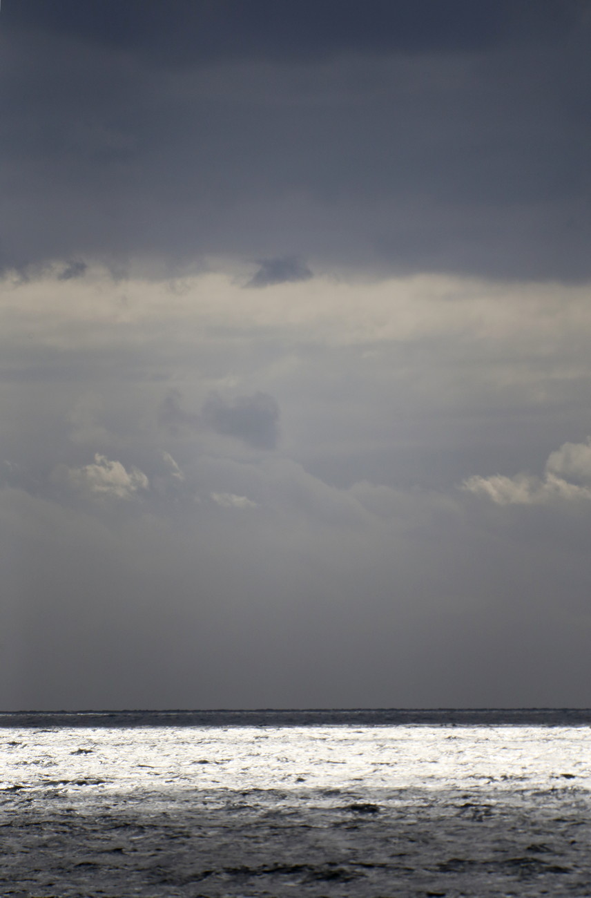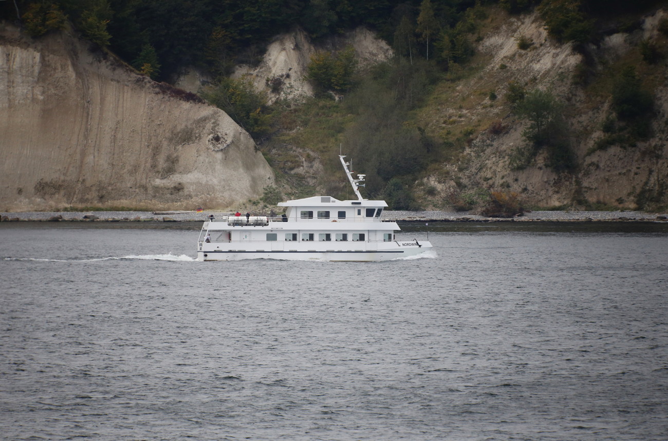 Merelle päästyämme kapteeni käänsi hanat auki, alus melkeinpä hypähti eteenpäin - ja nyt sitä savua vasta alkoikin tulla. Ihanaa. Kaiken muun hyvän lisäksi sivutuuli kävi ikävästi laivan kylkeen ja sai sen keikkumaan. Meitä nyt ei pieni tai keskisuuri merenkäynti haittaa, mutta kävelystä tuli hieman haastavaa, kun hippi horjahteli seinästä seinään aallokon jälkimainingeissa. Kapteeni kuuluttikin hetken päästä, että ulos ei saa mennä. Yritin istua tuolissa, mutta ei siitä mitään tullut: ihmiset ravasivat kannella kielloista huolimatta, jokainen ovenavaus päästi sisään röökin- ja dieselinkäryä sekä kylmää ilmaa. Merellä ainakin oli jo syys. Ohitimme ensin kalkkikivikallioita, sitten rakenteilla olevan tuulivoimapuiston - ja sitten ei mitään. Vielä äsken kovin iloluontoinen ja tuttavallinen pikkukoira muuttui ensin vakavaksi, oksensi sitten lattialle ja piiloutui kantokoppaansa häpeämään. Nolotti sen puolesta.
