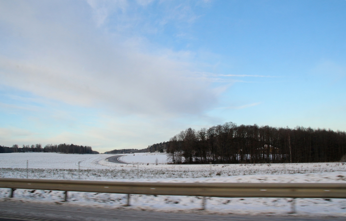 Matka joutui suuremmitta ongelmitta, taivas oli toisinaan kovin dramaattinen ja lehdettömät puut avasivat uusia näköaloja - välillä piti muistella, ollaanko oikealla tiellä ollenkaan. Eihän tästä olekaan ajettu edestakaisin kuin seitsemisen kertaa. Tyynet joet ja järvet, joista heijastuu kumpuileva taivas ja yllekaartuvat lumiset puut, niihin ei kyllästy. Yhtään sopivaa pysähdyspaikkaa ei tietenkään ollut, ei siis kuvia.
