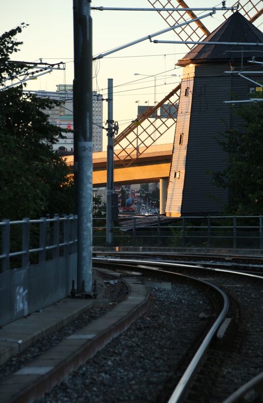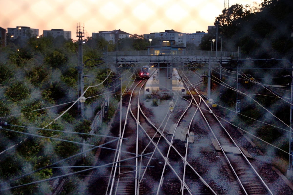 Auringonlaskussa kiiltävät raiteet. Ah.