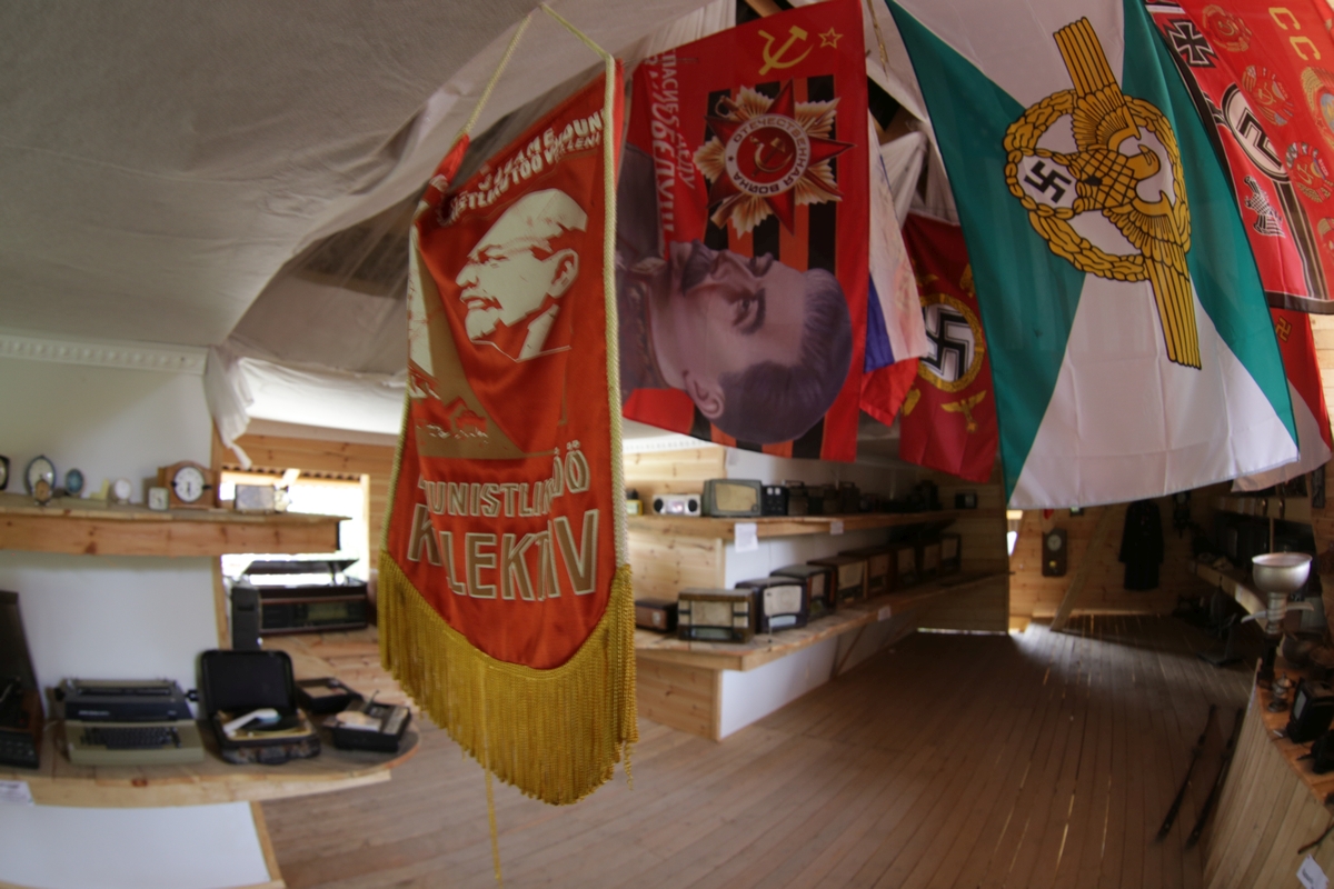 Yläkerrassa vanhoja radioita ja telkkareita.