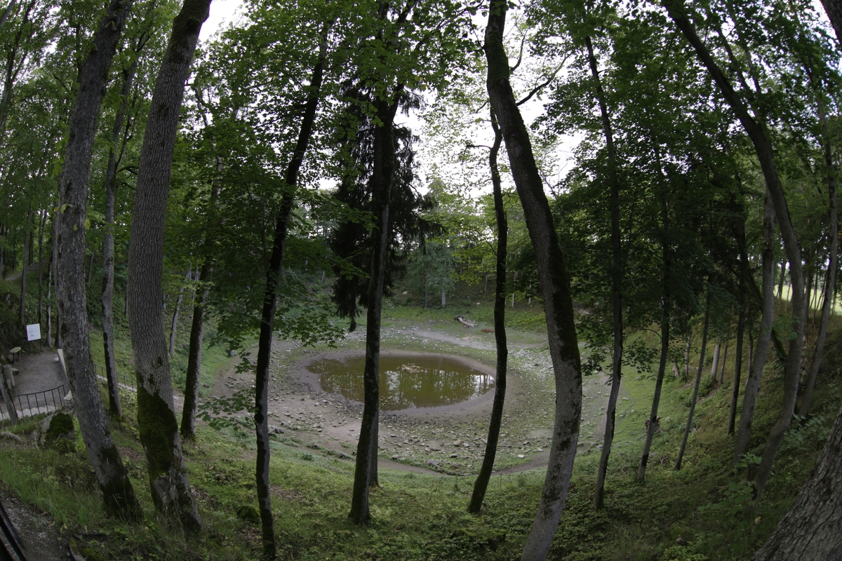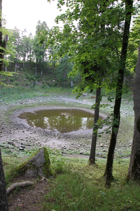 Pohjalla on vettä yleensä metri tai pari, nyt vähemmän. Joskus lampi kuivuu kokonaan.
